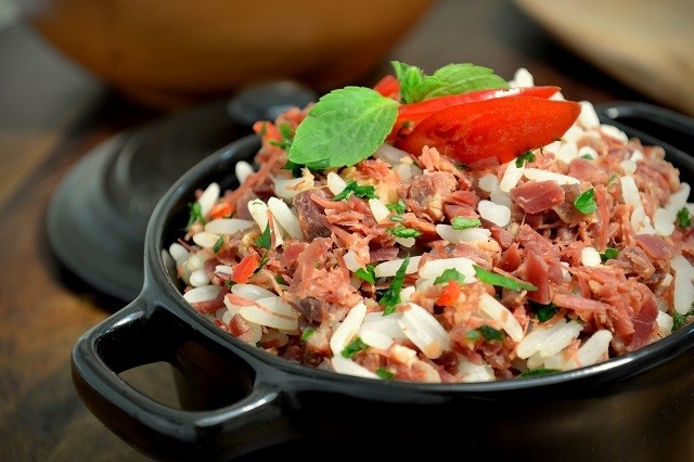MODO DE PREPARO - Deixe a carne seca de molho de véspera, troque a água e cozinhe até ficar macia. Desfie. Frite-a em uma panela com azeite. Quando a carne estiver dourada, coloque a cebola e o alho. Junte o arroz e frite. Acrescente a água fervente e cozinhe em fogo baixo até o arroz ficar macio. Salpique o cheiro-verde e sirva em seguida. Bom apetite.