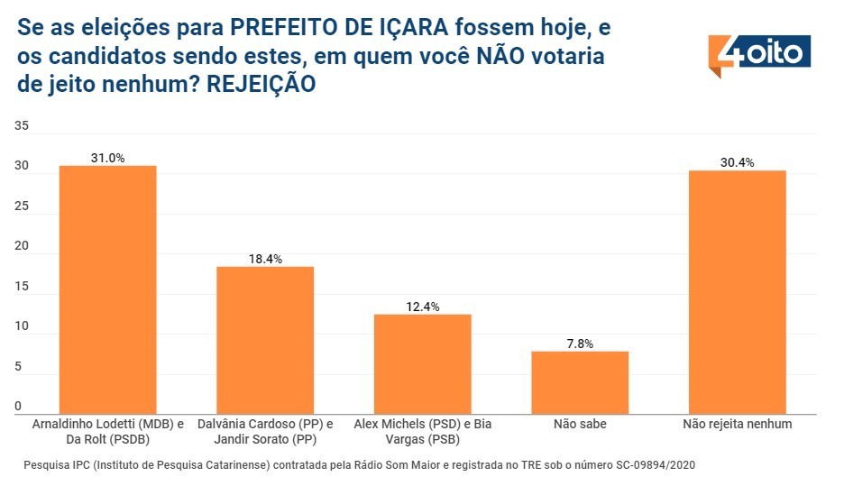 Quando questionado "em quem você não votaria de jeito nenhum", a mais citada foi a chapa de Arnaldinho Lodetti e Da Rolt, com 31%, enquanto 18,4% responderam que não votariam de jeito nenhum em Dalvânia e Jandir Soratto, e 12,4% rejeitam as candidaturas de Alex Michels e Bia Vargas. Um bom contingente, de 30,4%, não rejeita nenhum dos três, e 7,8% responderam que não sabem.