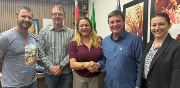 Na posse, estavam Sandro, a prefeita Dalvania, o vice-prefeito Alex Michels, a enfermeira Shirley Gazola, coordenação de atenção b;asica da Secretaria, e o enfermeiro Gustavo Schiliting, coordenador de atenção especializada.
