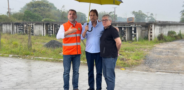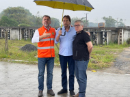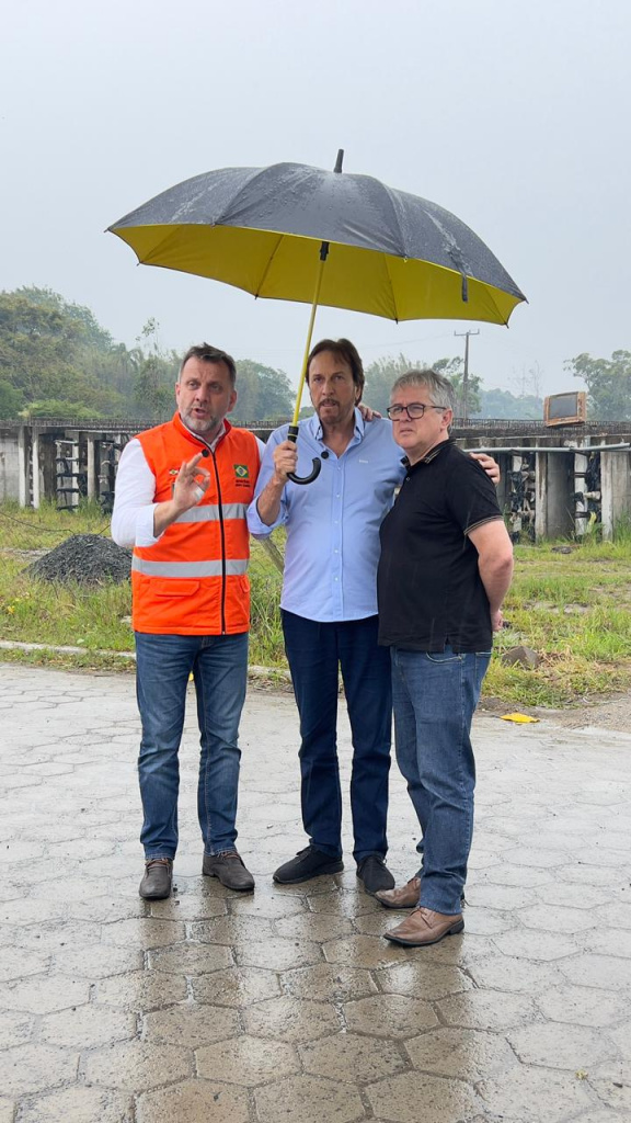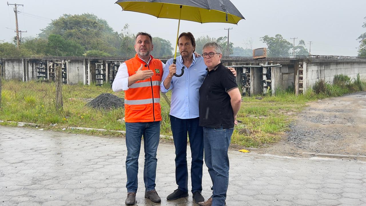 Protegido por um guarda chuva, por causa do mau tempo, o secretário de infraestrutura do estado, deputado Jerry Comper (MDB), visitou hoje à tarde o canteiro de obras da ponte de Ilhas em Araranguá.