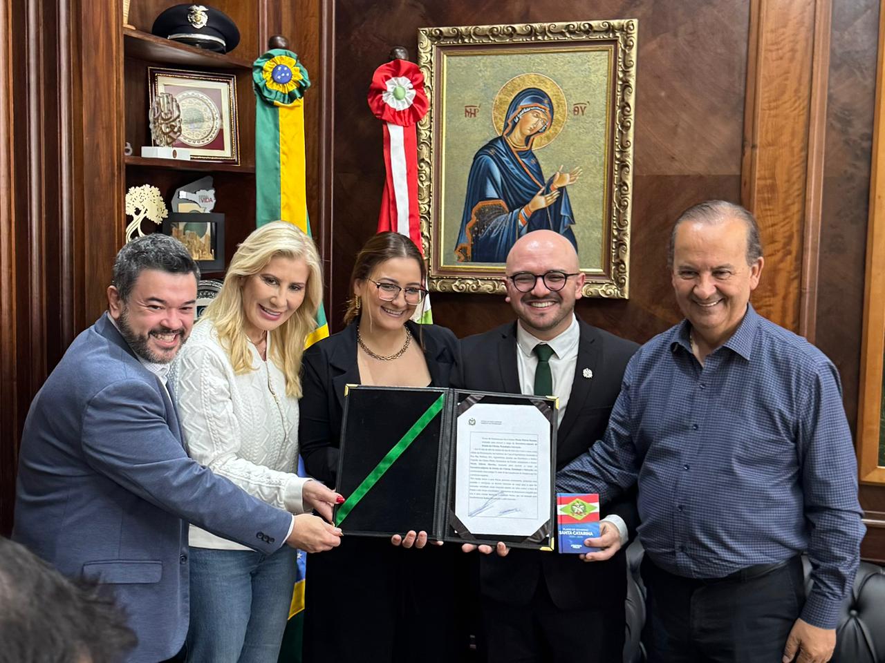 O governador Jorginho Mello (PL) deu posse no início da tarde, em gabinete, ao vereador criciumense Nicola Martins (PL) como secretário adjunto de Ciência e Tecnologia do estado.