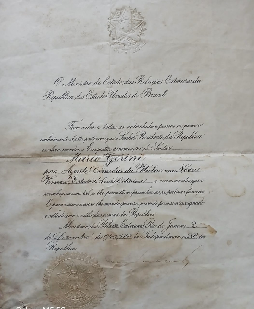 Meu avô Mário Gorini, o primeiro Agente Consular de Nova Veneza, recebeu o escudo em 1940.