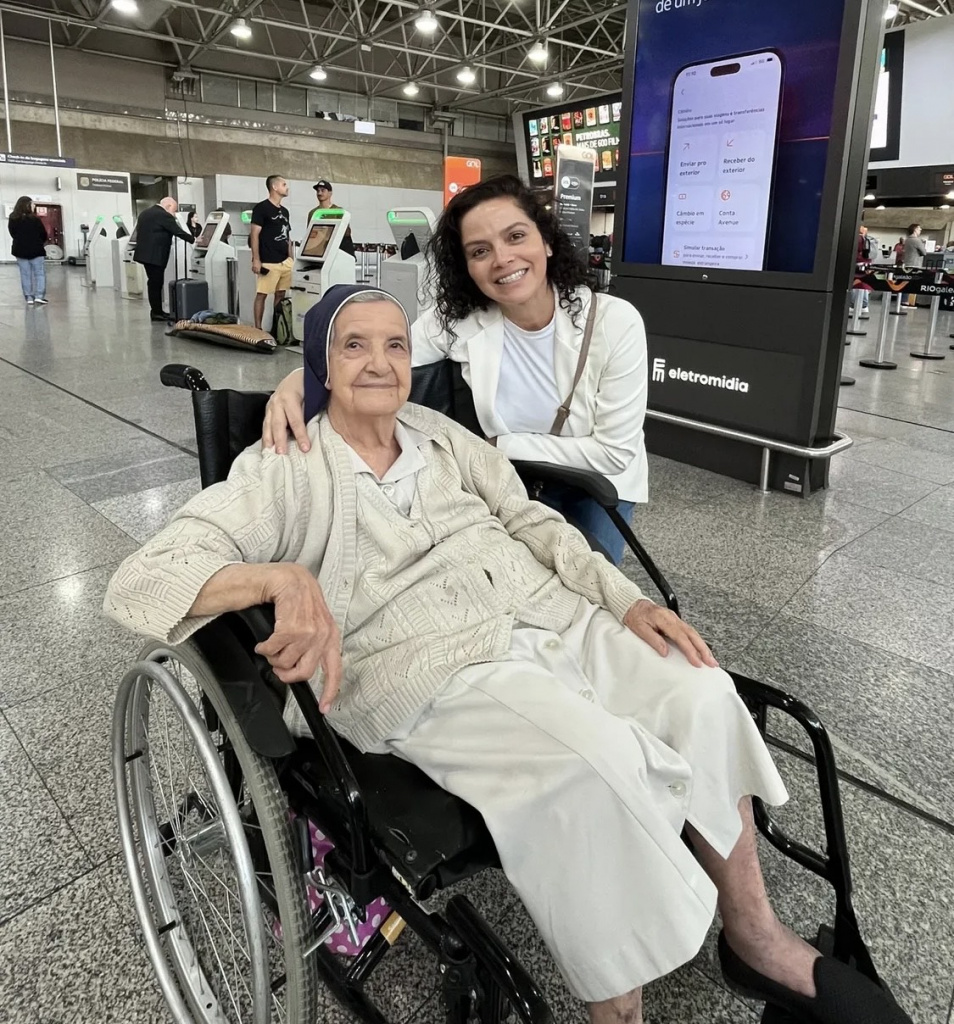 A jornalista Grazi Caldas, assessora de imprensa do Colégio Michel, ao lado da irmã Cláudia em registro feito no aeroporto, onde foi recebê-la para o lançamento do livro Os 70 Anos do Gigante Cor-de-Rosa – A História do Colégio Madre Teresa Michel. A obra será apresentada nesta quinta-feira, no auditório do Colégio Michel, em uma celebração especial da trajetória da instituição. Aos 100 anos, irmã Cláudia traz o simbolismo de ter presenciado a colocação da Pedra Fundamental, o que torna sua presença ainda mais marcante nesta noite histórica