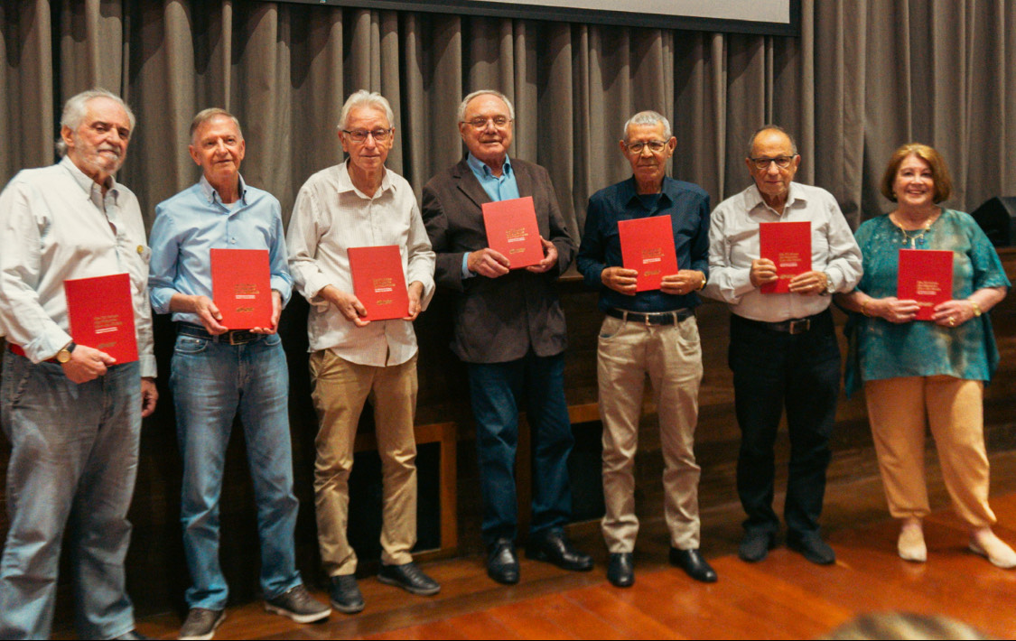 Estudantes formados em 1959, primeira turma do Colégio Michel marcaram presença no evento de lançamento do livro 70 anos de Michel. Da esquerda para direita, Joaquim de Bem, Silvino Soratto, Valmor Biff, Júlio Wessler, Valmiré Veiga, Rodeval Alves e Zurene Póvoas Carneiro.