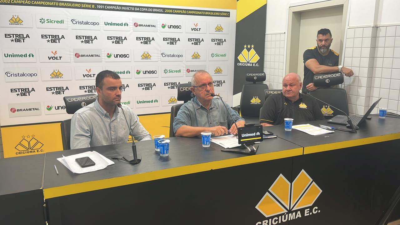 Em uma coletiva de quase uma hora, o presidente do Criciúma, Pedro Paulo Canella, o primeiro vice-presidente, Matheus Benetton, e o diretor financeiro e administrativo, Deloir Brunelli, abordaram temas envolvendo finanças, estrutura interna, renovações, vazamentos de informações e planos para 2026.