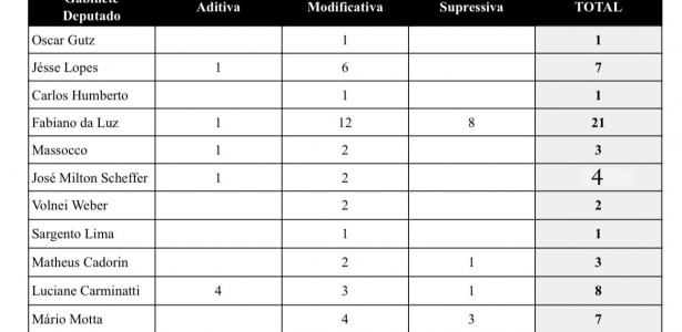 A última emenda ao projeto foi protocolada quando faltava 20 minutos para acabar o prazo. Foi da deputada Lucaine Carminatti, às 23h39min. Ao todo, a deputada protocolou 19 emendas.