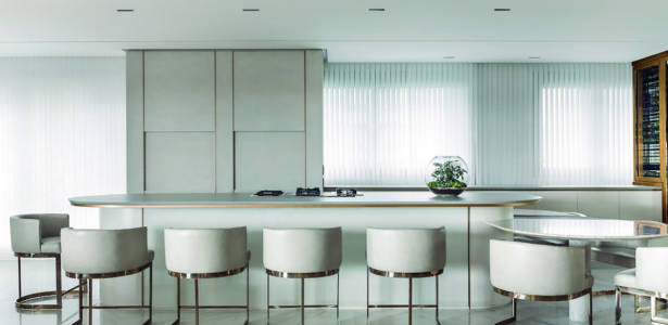 O modelo pode ser aplicado em apartamentos com planta aberta ou em casas maiores, desde que a marcenaria e os eletrodomésticos embutidos sejam planejados desde o início do projeto.