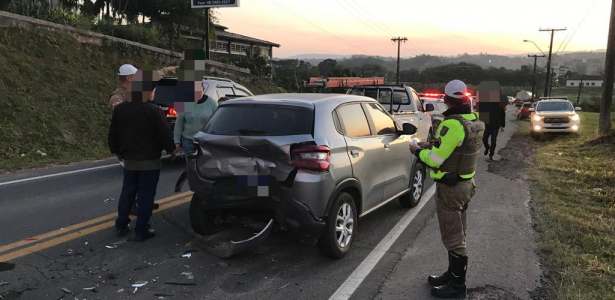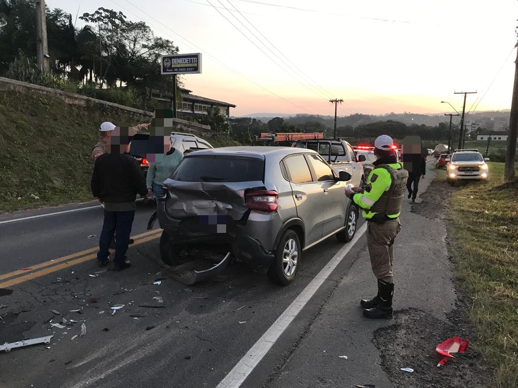 Três veículos se envolveram em um acidente de trânsito na Rodovia Genésio Mazon, em Urussanga, no fim da tarde dessa segunda-feira (14). Duas pessoas ficaram feridas e foram encaminhadas ao Hospital Nossa Senhora da Conceição.