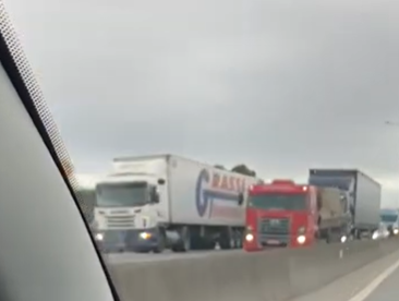Um acidente envolvendo um carro de passeio e um caminhão causa filas na BR-101, em Imbituba. São pelo menos quatro quilômetros de lentidão no sentido Norte – Sul.