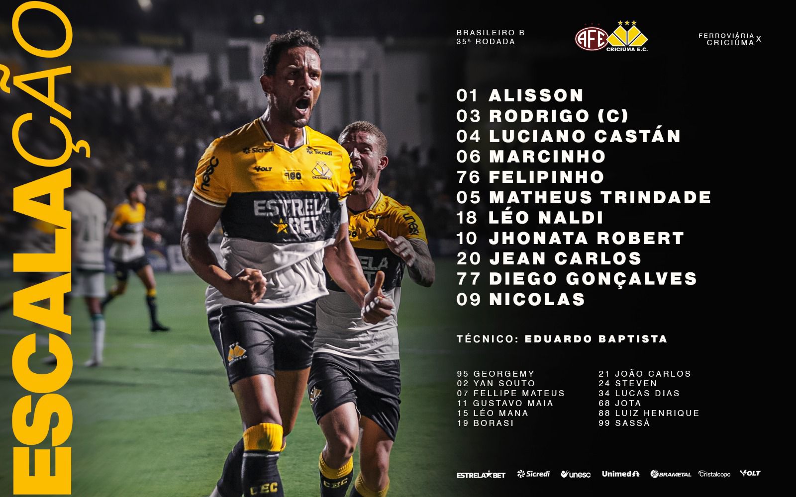 O Criciúma enfrenta, fora de casa, a Ferroviária nesta noite de sexta-feira (31), em um confronto em que apenas a vitória interessa ao Tigre, que busca seguir forte na briga pelo acesso à Série A do Campeonato Brasileiro. A bola rola para o confronto válido pela 35ª rodada a partir das 21h35, na Arena Fonte Luminosa, em Araraquara, no interior de São Paulo.