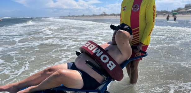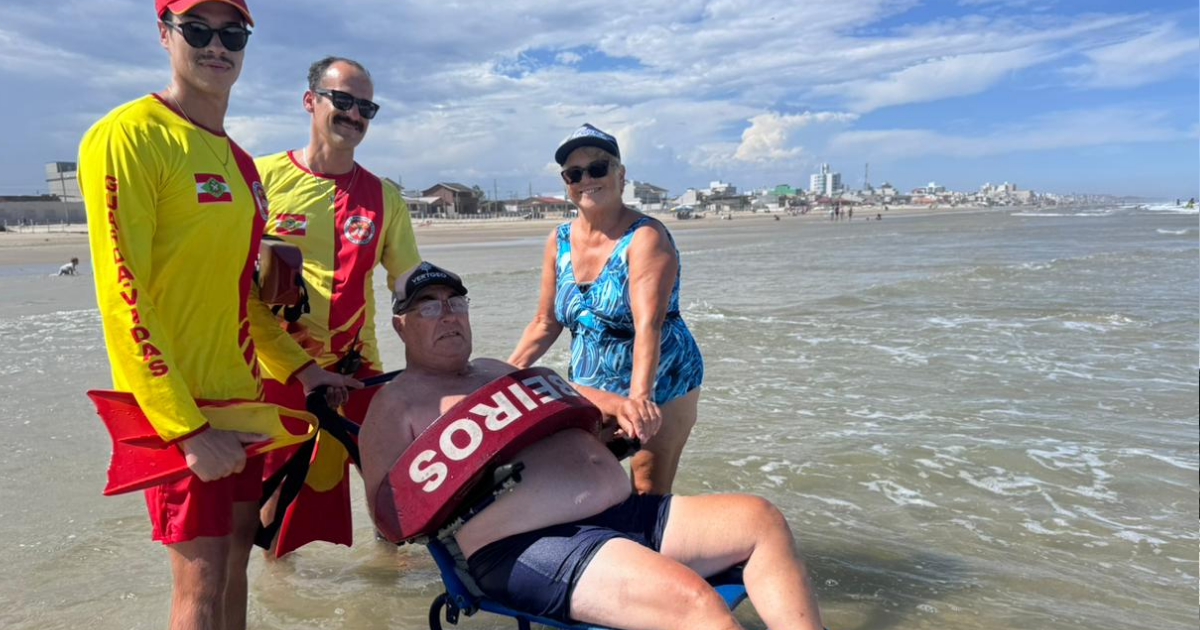 A iniciativa é desenvolvida pelo Corpo de Bombeiros Militar de Santa Catarina (CBMSC). Com apoio do programa, João agora consegue acessar a água com auxílio de uma cadeira anfíbia.