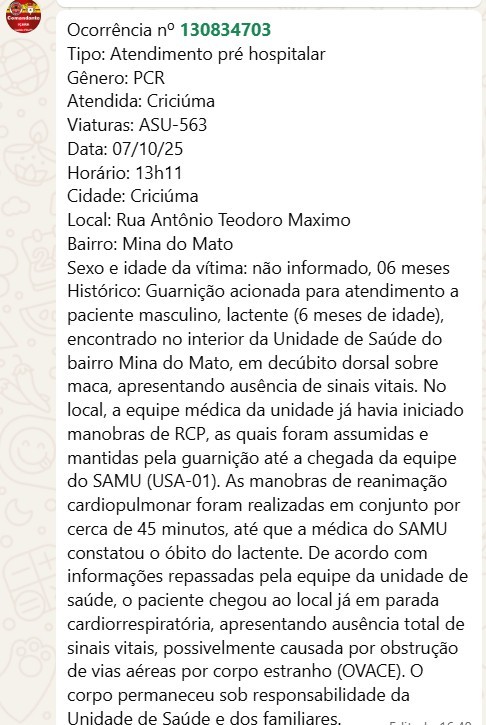 A Secretaria de Saúde de Criciúma informa que, a respeito do bebê de seis meses que veio a óbito na tarde desta terça-feira (7), a entrada da criança na Unidade Básica de Saúde (UBS) do bairro Mina do Mato ocorreu por volta das 13h10.