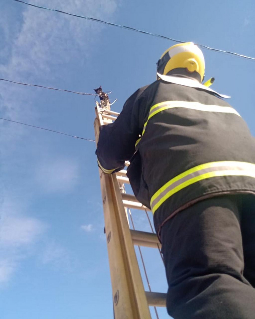 Em Jaguaruna, os bombeiros voluntários resgataram um gato de cima de um poste de energia elétrica. O fato aconteceu por volta das 11h30, no bairro Beija Flor.