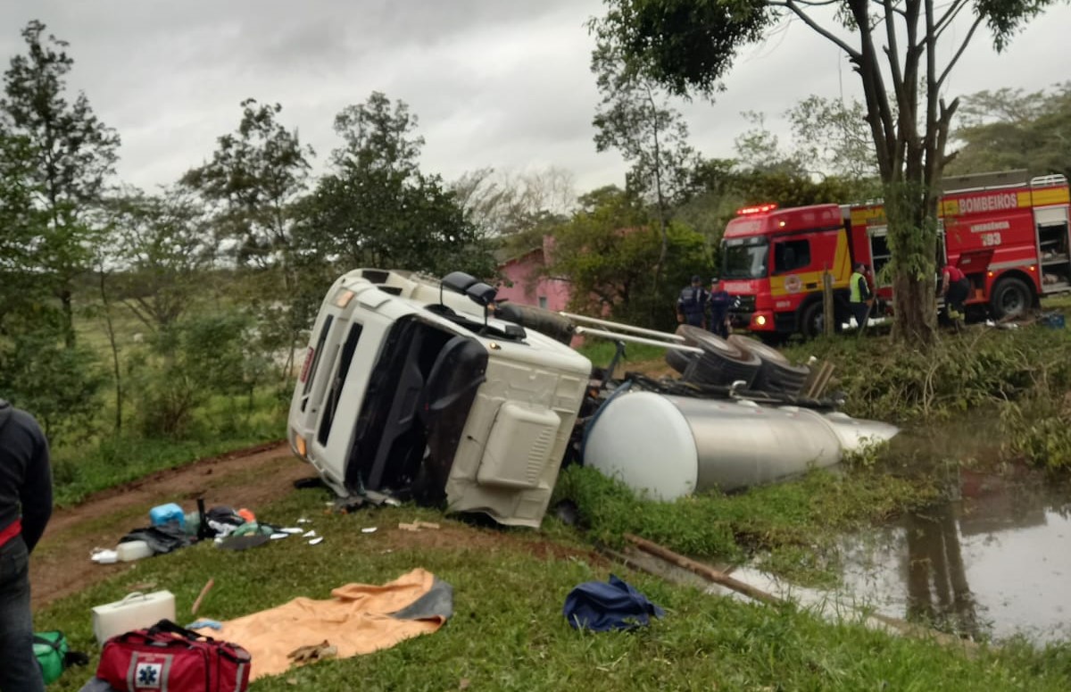 Um caminhão tombou e caiu em um açude no bairro Quarta Linha, em Criciúma, na tarde desta quarta-feira (21). O veículo estava carregado com água e, após o tombamento, ficou lateralizado com a parte traseira parcialmente imersa na água. O motorista ficou preso às ferragens.