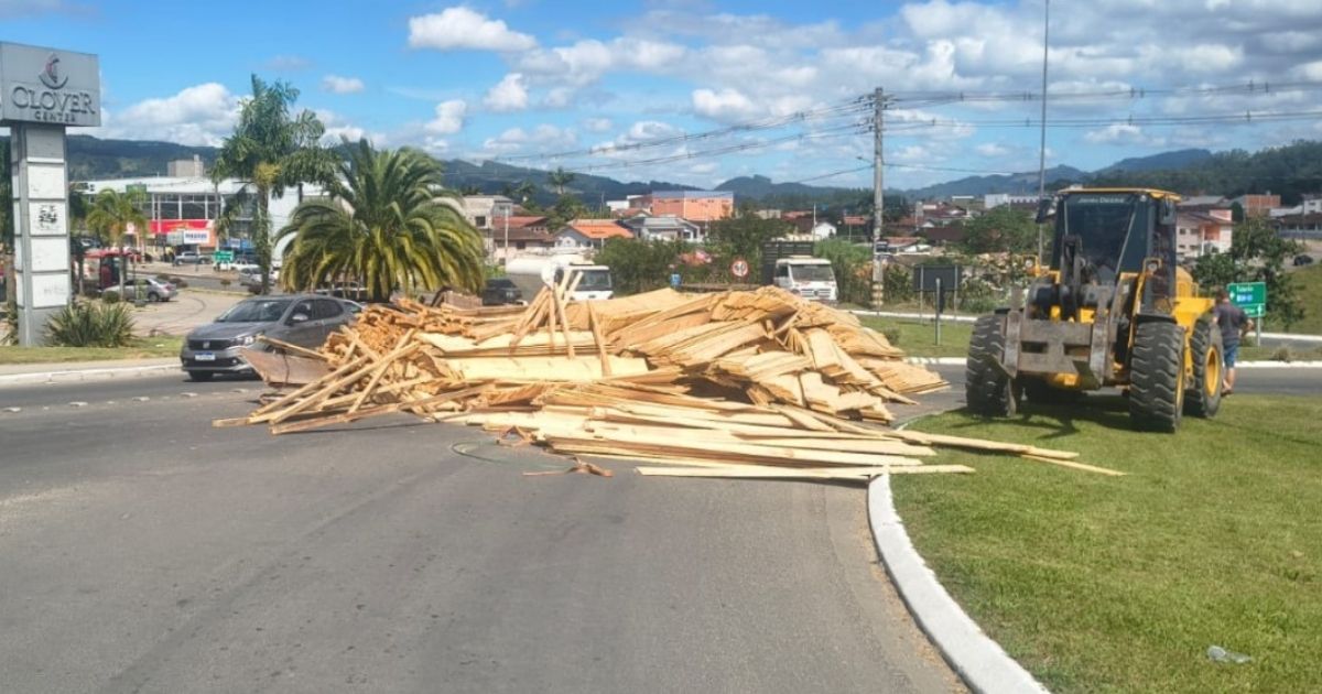Uma carga de madeira caiu de um caminhão e ficou espalhada na pista da SC-370, no trevo de acesso a Braço do Norte, na tarde desta terça-feira (14).