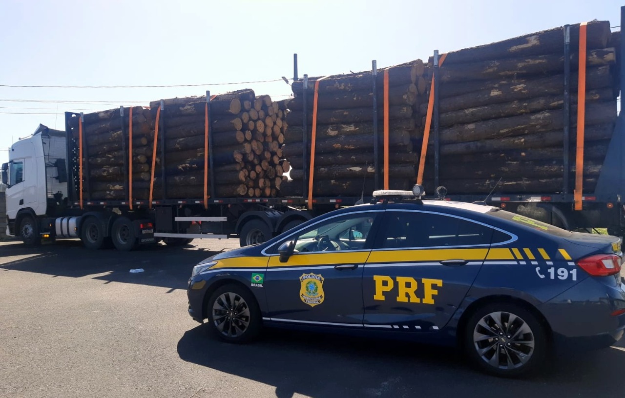 O Scania placas de São João Batista transportava toras de madeira pinus. O veículo somente seguiu viagem após a carga excedente ser transbordada para outra carreta.