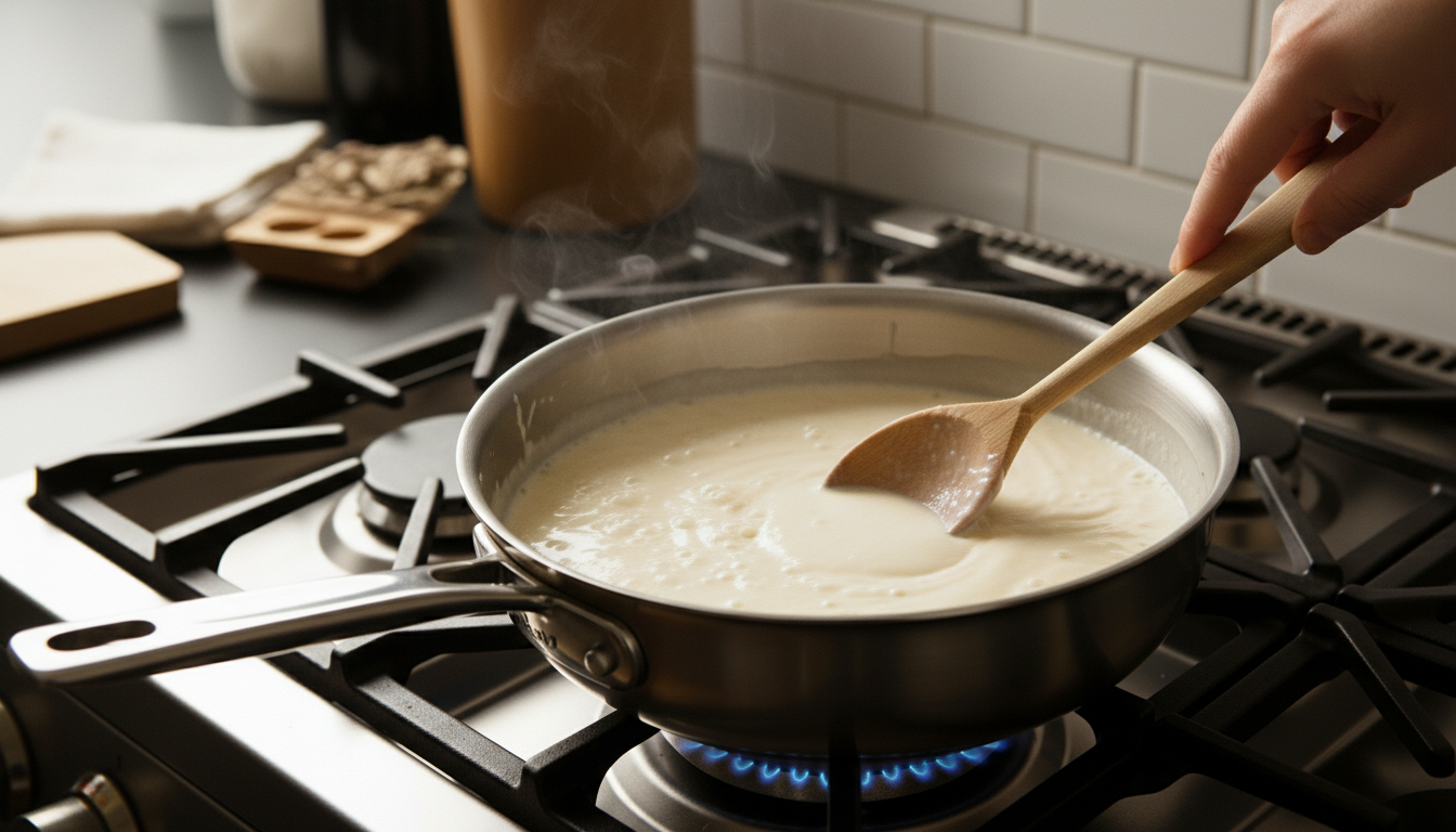 Com o roux ainda quente, acrescente o leite gelado aos poucos, mexendo sem parar. Esse contraste de temperatura evita a formação de grumos. -