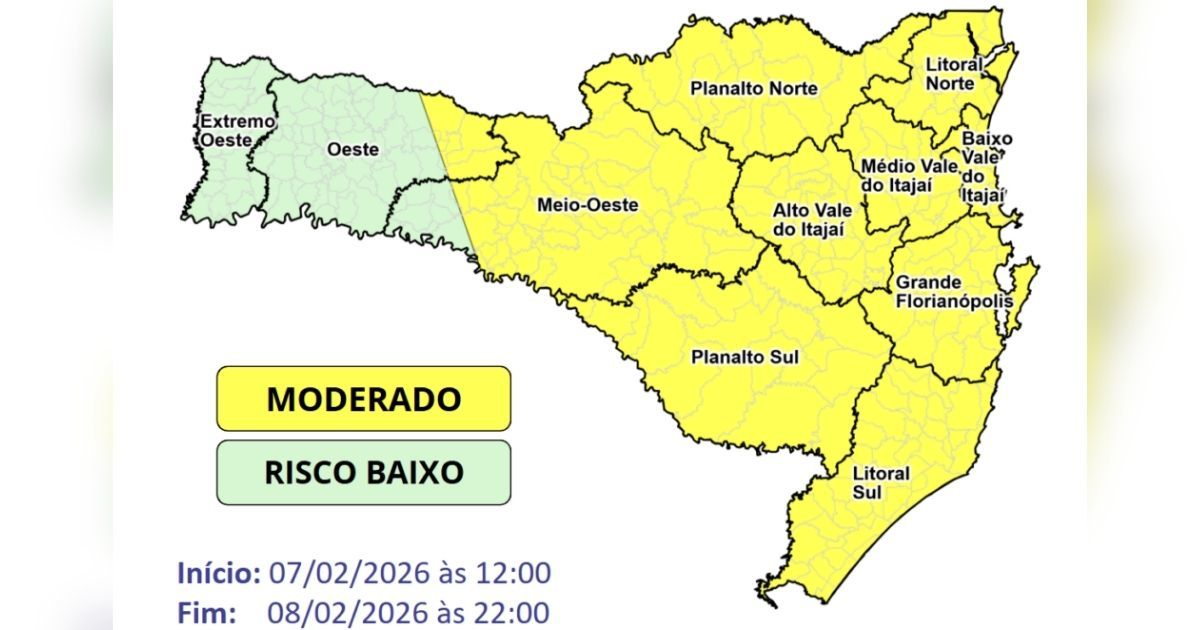 Conforme o comunicado da Defesa Civil, as temperaturas mais elevadas devem ser registradas no Grande Oeste e nas áreas do Planalto Norte, Alto e Médio Vale do Itajaí, com máximas em torno de 36°C a 38°C.