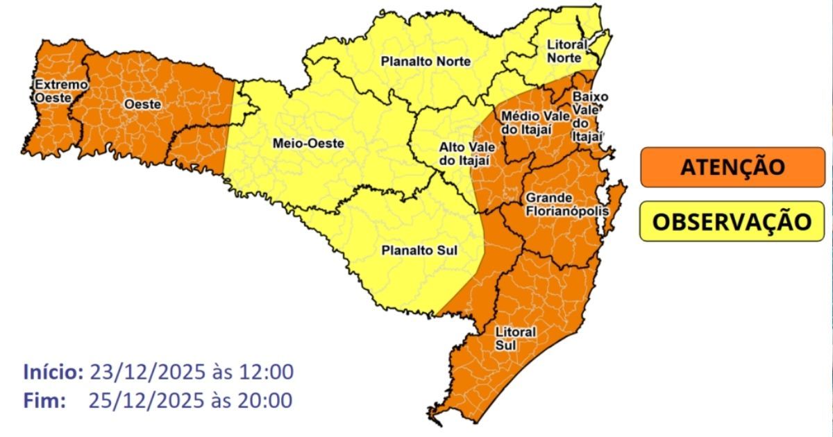 A Defesa Civil de Santa Catarina informou que, entre a tarde e a noite desta terça-feira (23), há risco de temporais com chuva intensa na região Sul do estado. Conforme o coordenador do órgão na Associação de Municípios da Região de Laguna (Amurel), Jeferson da Silva, haverá muita água em um curto período.