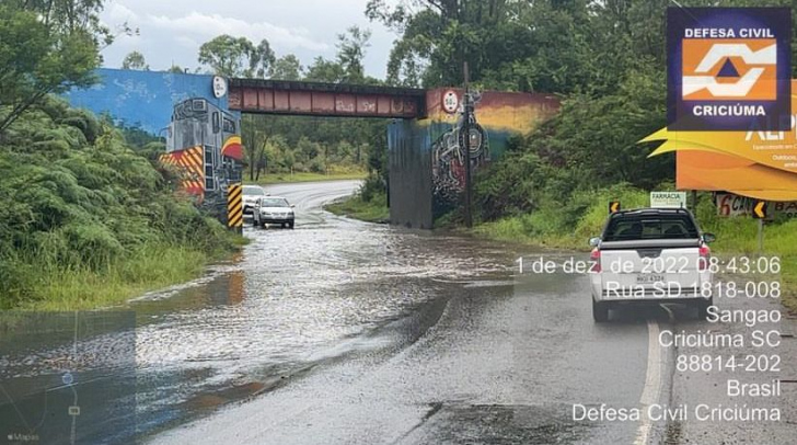 Devido a grande quantidade de chuva, o pontilhão próximo ao bairro Sangão, em Criciúma, apresenta inundação em parte da via. O registro foi feito na manhã desta quinta-feira (1°). A orientação da Defesa Civil é passar pela rua com cautela e velocidade reduzida.