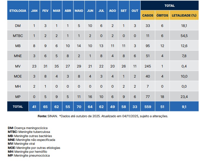 Entre janeiro e outubro, 559 notificações de meningite foram registradas no estado, número inferior ao de 2023 (993) e de 2024 (762). A maior taxa de incidência ocorre em crianças de até 4 anos.