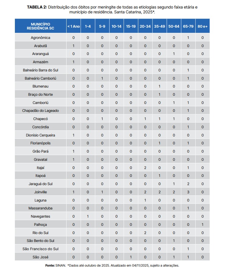 Em Criciúma, foram notificadas 31 ocorrências de meningite neste ano, sendo um caso de doença meningocócica. Neste registro, familiares que residiam com o paciente receberam quimioprofilaxia. Na região sul, seis mortes foram contabilizadas, nos municípios de Araranguá, Armazém, Braço do Norte, Grão-Pará, Gravatal e Laguna.