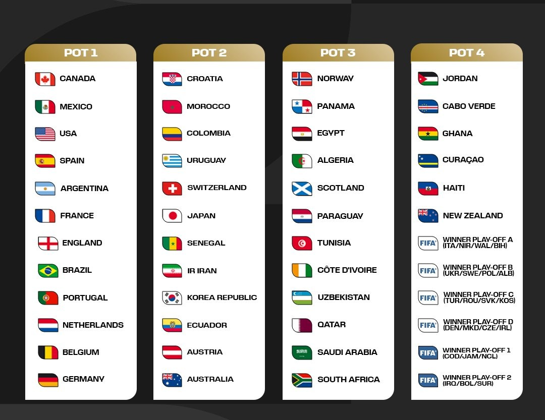 As 42 seleções já classificadas foram distribuídas em quatro potes com 12 equipes cada um, baseados no Ranking da FIFA (com exceção dos países-sede, que estão no Pote 1). Ainda há outras seis seleções que vão garantir a vaga via repescagem (quatro da Europa e duas do resto do mundo), e estão todas dispostas no pote quatro.