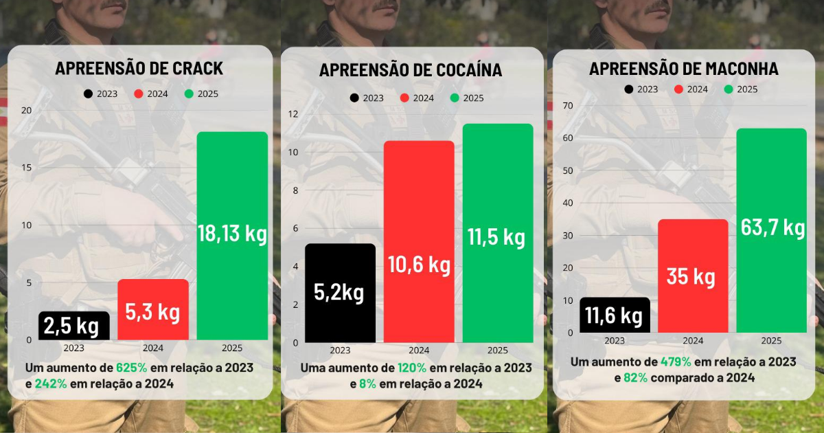 O número já supera o total registrado em anos anteriores. Em 2024, foram apreendidos 30 kg de maconha ao longo de todo o ano. Em 2025, o volume chegou a cerca de 62 kg. Apenas em janeiro de 2026, a quantidade apreendida é mais que o dobro do total de 2025 e cinco vezes maior que a de 2024.