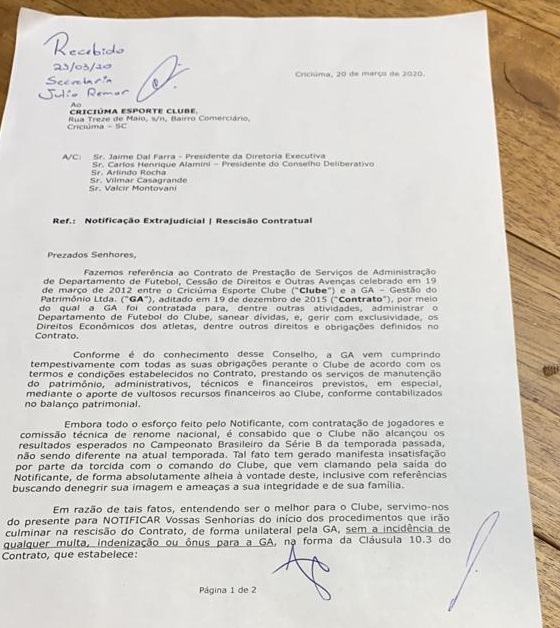 O presidente Jaime Dal Farra anunciou, no fim da tarde desta quinta-feira, 14, que está deixando o comando do Criciúma. Ele encaminhou à diretoria uma notificação extrajudicial que trata da rescisão contratual entre a GA e o Criciúma. Na prática, põe fim à atual gestão a partir de 31 de dezembro. Até lá, continua, em um processo gradual de transição.