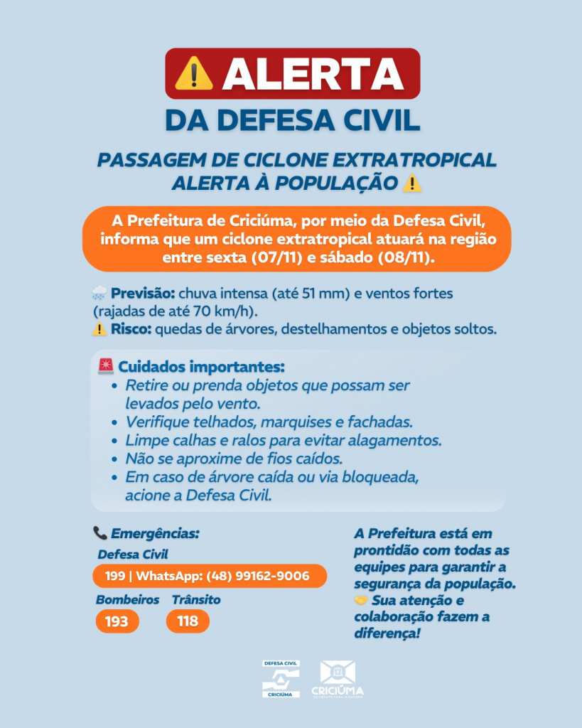 A Defesa Civil de Criciúma emitiu um alerta nesta sexta-feira (7) devido à previsão de chuva intensa e ventos fortes provocados pela atuação de um ciclone extratropical na região Sul de Santa Catarina. O fenômeno deve ocorrer entre esta sexta e sábado (8), com acumulados de até 51 milímetros de chuva e rajadas de vento que podem chegar a 70 km/h, especialmente no período entre 9h e 14h de sábado.