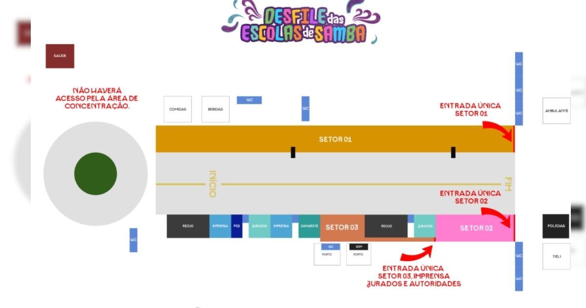 A passarela do samba foi organizada em setores definidos, incluindo áreas para o público em geral, jurados, imprensa, autoridades e recuos das baterias. Também foram distribuídos banheiros químicos ao longo do circuito, além de espaços de apoio à saúde, segurança e alimentação.
