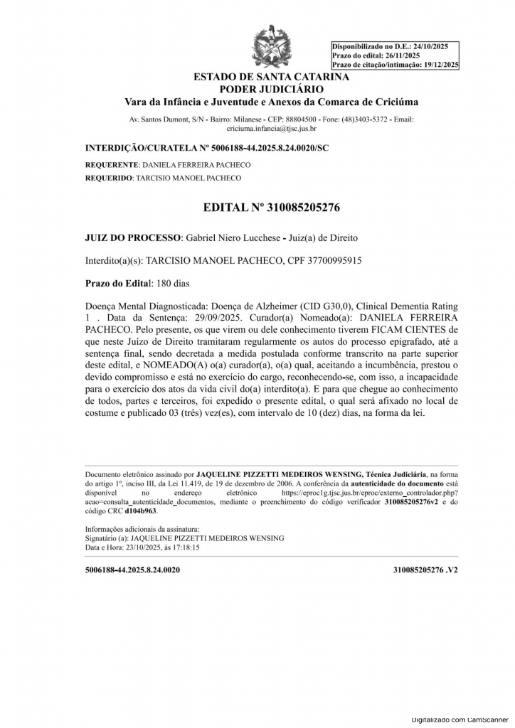 Doença Mental Diagnosticada: Doença de Alzheimer (CID G30,0), Clinical Dementia Rating 1 . Data d a Sentença: 29/09/2025. Curador(a) Nomeado(a): DANIELA FERREIRA PACHECO. Pelo presente, os que virem ou dele conhecimento tiverem FICAM CIENTES de que neste Juízo de Direito tramitaram regularmente os autos do processo epigrafado, até a sentença final, sendo decretada a medida postulada conforme transcrito na parte superior deste edital, e NOMEADO(A) o(a) curador(a), o(a) qual, aceitando a incumbência, prestou o devido compromisso e está no exercício do cargo, reconhecendo-se, com isso, a incapacidade para o exercício dos atos da vida civil do(a) interdito(a). E para que chegue ao conhecimento