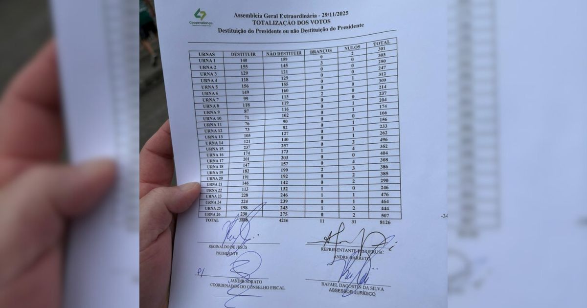 Mais de oito mil cooperados tiveram a oportunidade de votar. No total, foram 4.216 votos a favor e 3.868 votos contra, que definiram pela manutenção de Dedê de Jesus na presidência.