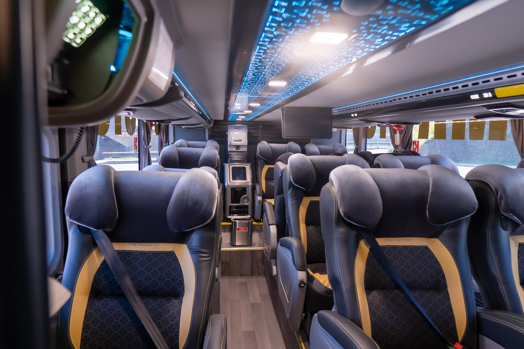 O ônibus do Criciúma tem detalhes em amarelo no interior.