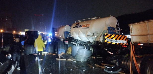 De acordo com a Polícia Rodoviária Federal (PRF), três faixas estão interditadas em função do acidente que envolve veículos de carga.
