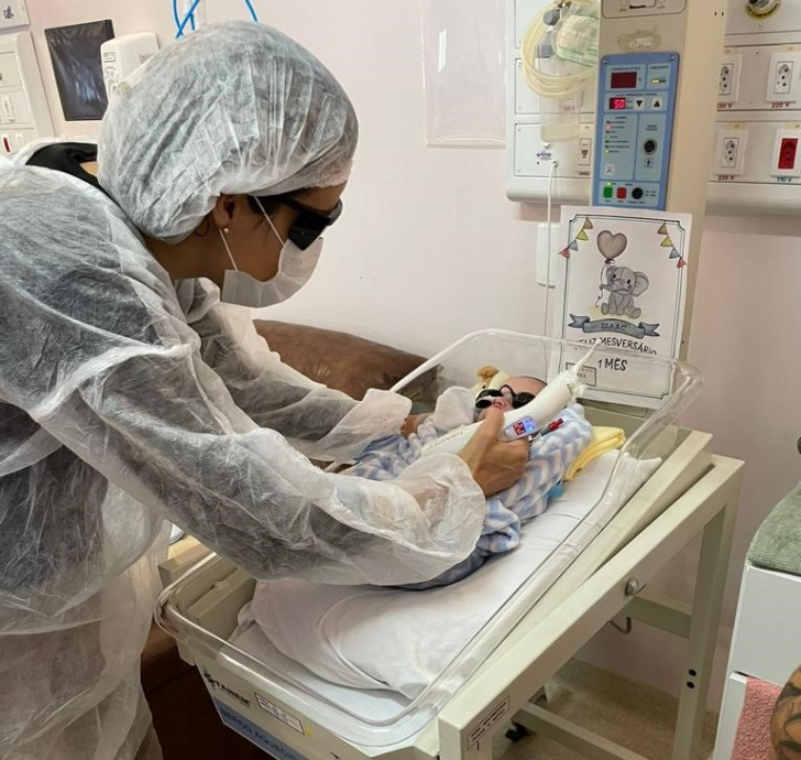 O pequeno Isaac, de um mês de idade, foi um dos primeiros beneficiados. Ele acabou de sair da UTI e hoje está na Unidade de Cuidados Intermediários (UCI), onde faz uso de traqueostomia porque apresenta dificuldades de deglutição. “O laser foi associado a outras técnicas fonoaudiólogas sendo mais um componente para ajudar o bebê a ter o controle da deglutição. Além dos exercícios, a gente faz uso do laser para otimizar os resultados e ativar a musculatura do paciente”, explicou a fonoaudióloga.