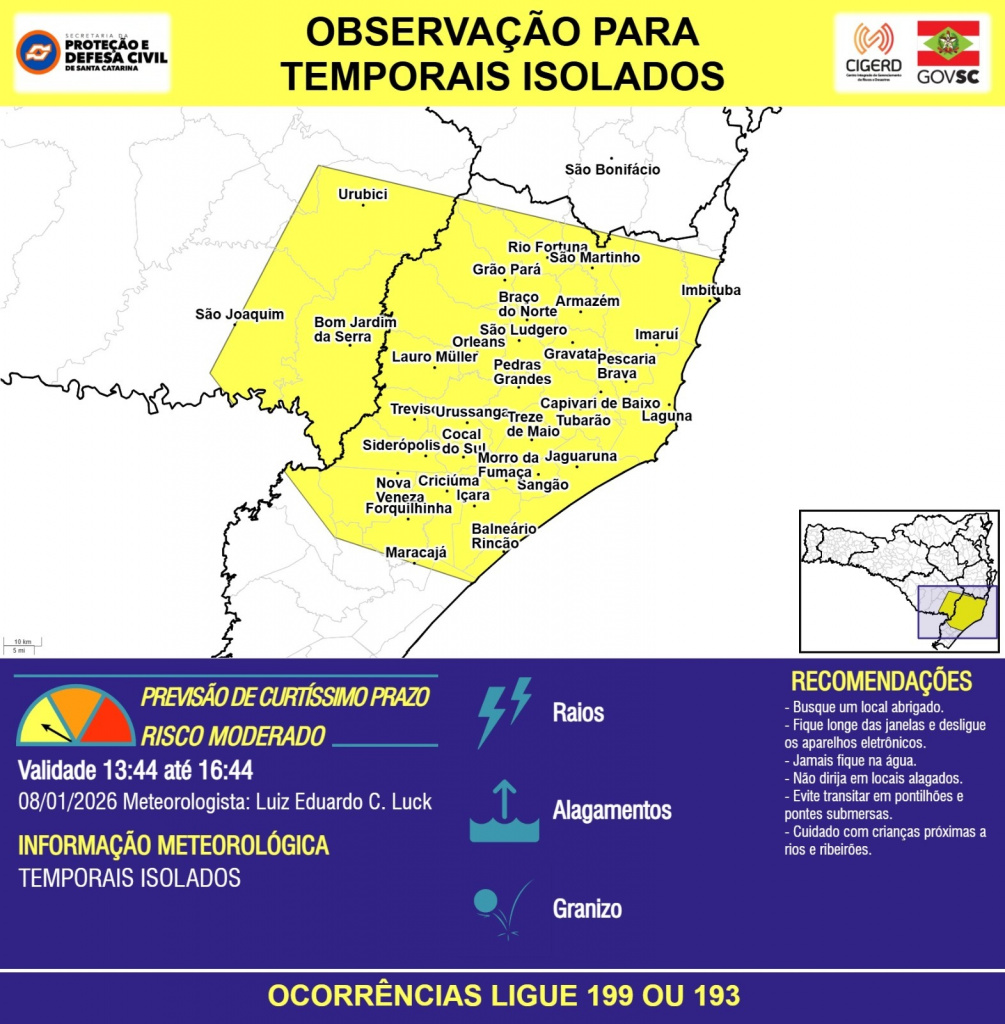 Diante desse cenário, a Defesa Civil emitiu um alerta para temporais isolados, com raios, granizo e alagamentos pontuais nas próximas horas. O aviso vale para diversos municípios, entre eles Criciúma, Içara, Forquilhinha, Morro da Fumaça, Urussanga, Orleans, Tubarão, Laguna, Imbituba, Jaguaruna, Braço do Norte, Gravatal, São Joaquim, Urubici e outras cidades do Sul e da Serra catarinense.