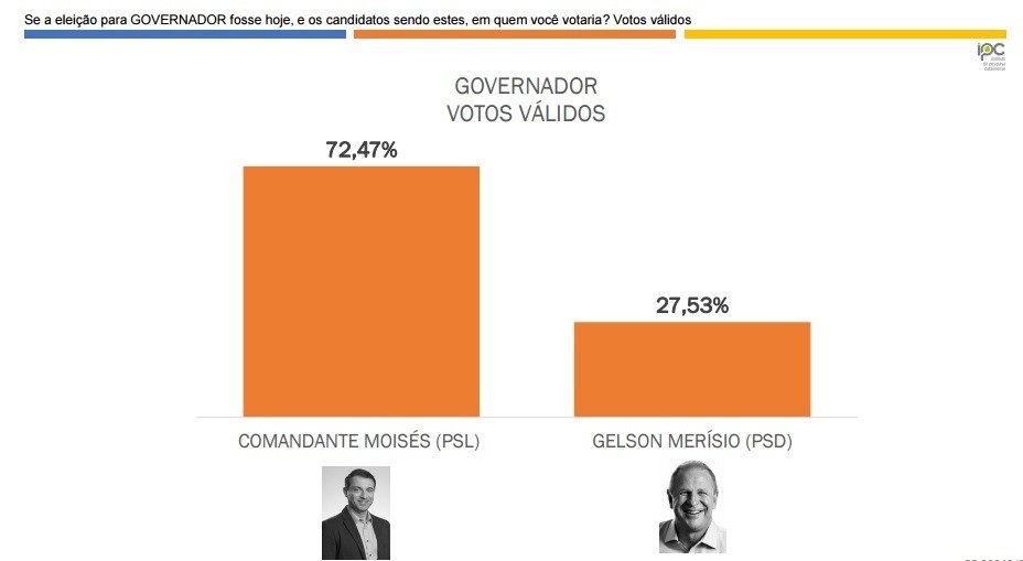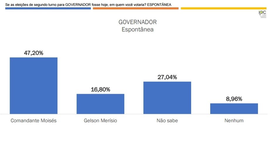 Comandante Moisés vai ganhar a eleição para 51,2% dos entrevistados, enquanto Gelson Merisio será o vencedor para 21,76% dos eleitores ouvidos, e 27,04% responderam que não sabem.