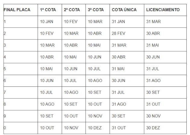 Cota única: pagamento até o fim do mês conforme o final da placa. Placas com final 1 vencem em 31 de janeiro.