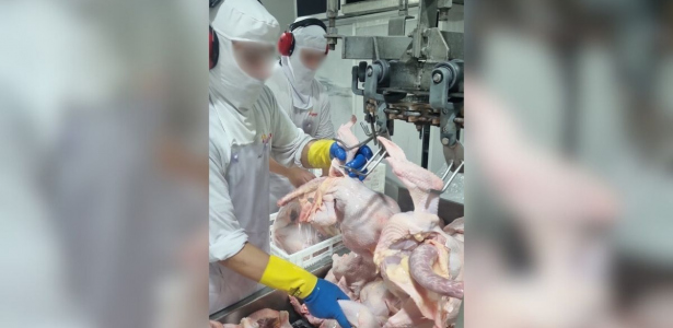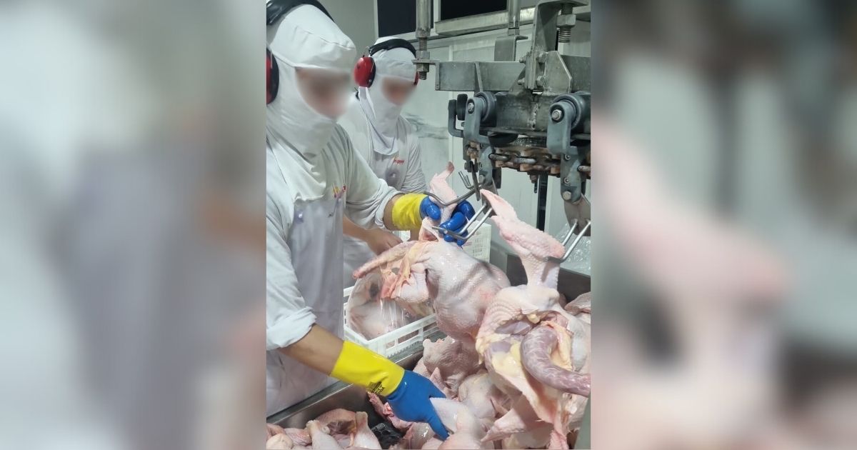 Em um frigorífico fiscalizado, um adolescente trabalhava em uma plataforma suspensa, retirando as vísceras de um suíno abatido. A atividade era realizada em altura, em meio a sangue e resíduos do abate, com risco de queda e contato direto com material biológico.