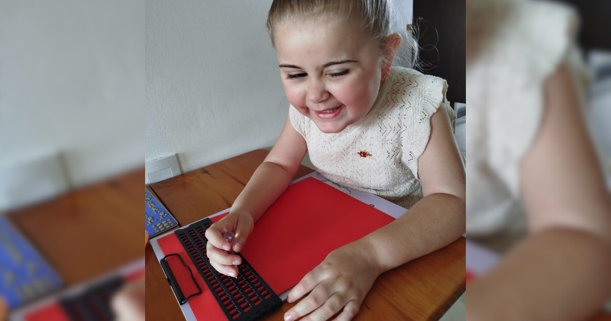 A ideia da cartinha começou dias antes, quando Clara e Papai Noel se encontraram pela primeira vez no shopping. Encantada com o Bom Velhinho, a menina prometeu escrever uma mensagem especial. E cumpriu. Com a ajuda da mãe e utilizando a reglete, instrumento usado para escrita em braile, ela preparou cada pontinho com dedicação.