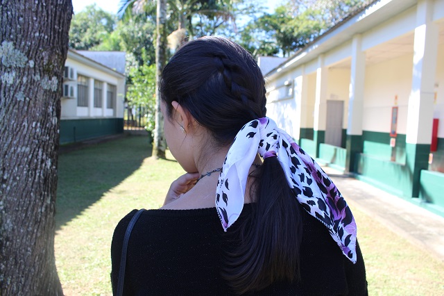 Os lenços podem ser usados como assessórios de cabelo, por exemplo, em forma tiara ou amarrado no rabo de cavalo baixo. Outra ideia é usar como complemento do look, amarrado no pescoço, bolsa ou passador de cinto, dependendo do estilo de cada um. “Quando as pessoas têm os seus estilos em mente, isso é, o jeito que elas gostam de se sentir ao se vestir, não importa se uma peça está na moda ou não, porque vai fazer sentido para ela”, afirma Paula.