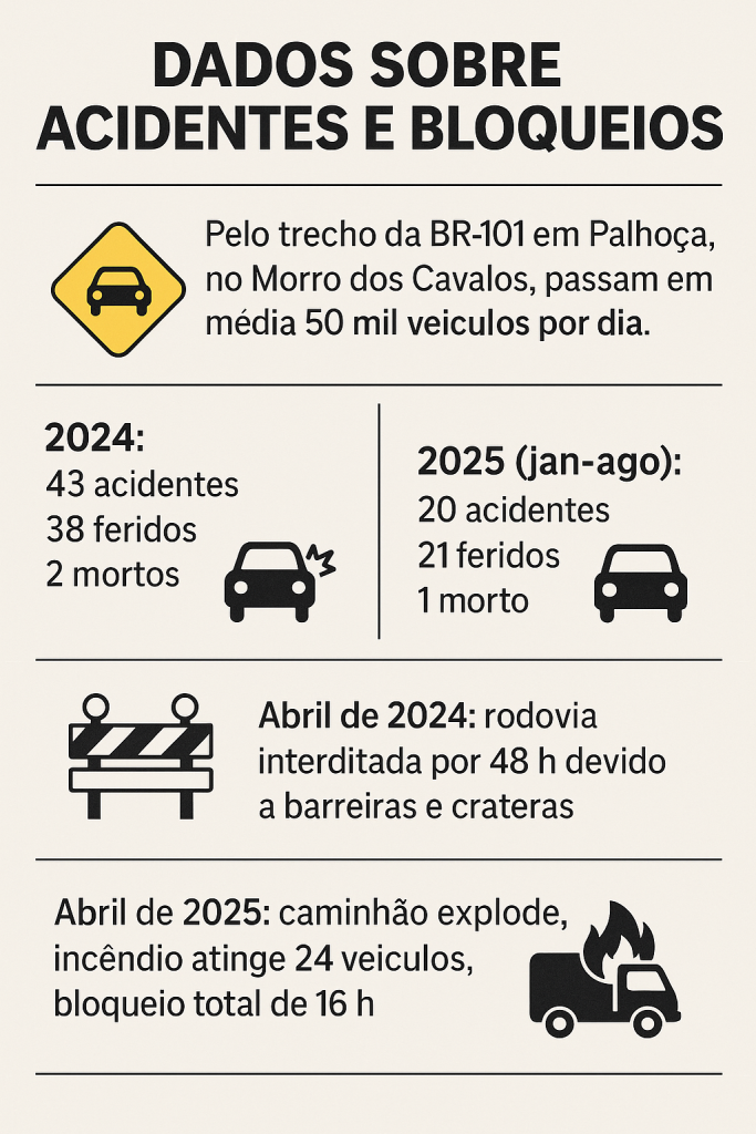 Diariamente na BR-101, em Pallhoça, no trecho do Morro dos Cavalos circulam em média 50 mil veículos, conforme levantamento repassado pela Polícia Rodoviária Federal. Segundo a concessionária do trecho, Arteris Litoral Sul, entre janeiro de 2023 e agosto de 2025 ocorreram 43 interdições no trecho, incluindo acidentes, quedas de barreiras, detonação de rocha e incêndios. O maior bloqueio foi em 6 de abril de 2025, com explosão de caminhão e outros 24 veículos, mantendo a rodovia interditada por 13h37min.