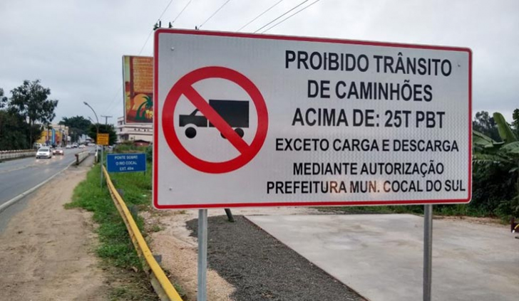 Desde segunda-feira (8) caminhões com peso total acima de 25 toneladas ou com mais de 14 metros de comprimento não podem passar pela área central de Cocal do Sul. A medida foi tomada como parte da instalação do sistema binário, que já está valendo desde maio.