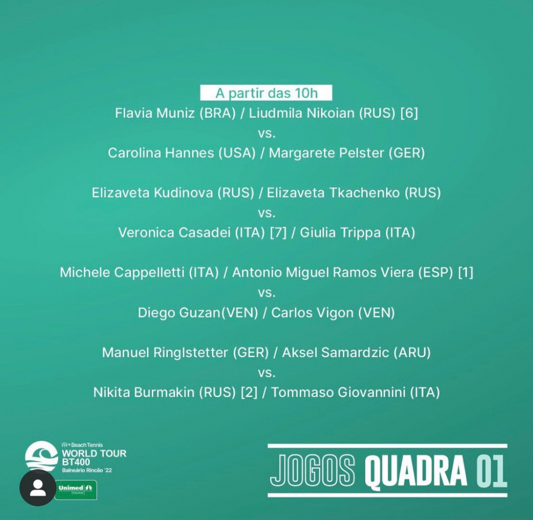 • Não antes das 17h – Quartas-de-final Duplas Mistas – Quadra Central