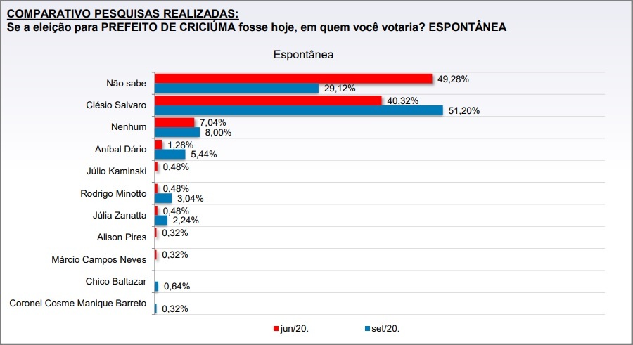"Se a eleição para prefeito de Criciúma fosse hoje, em quem você votaria?" é a pergunta da pesquisa espontânea, quando o pesquisador não apresenta os nomes dos candidatos. O mais citado foi Clésio Salvaro, com 51,2%. Os que não sabem foram 29,12%, e os que não votam em nenhum são 8%.