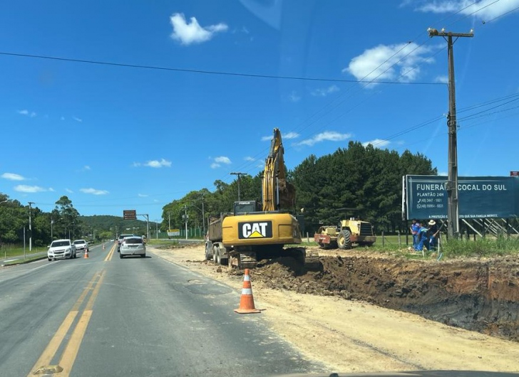 No local, há cones de sinalização para orientar os motoristas na rodovia. Os trabalhos estão sendo executados pela Setep, empresa vencedora da licitação, desde setembro deste ano e deve ser concluída em, aproximadamente, 30 meses. A obra conta com cerca de 16 quilômetros de extensão e inclui o Anel de Contorno Viário de Cocal do Sul.