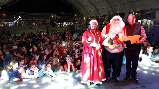 A noite encerrou com a chegada dos Bons Velhinhos. O Papai e a Mamãe Noel chegaram no fim da tarde no município e percorreram as principais comunidades. Após o roteiro, eles chegaram na Praça Central por volta das 21h, o que encantou e atraiu os olhares de muitas crianças. O casal Noel subiu ao palco e foi recepcionado pelo prefeito Juscelino da Silva Guimarães, o Mineiro, que realizou a entrega da chave da casinha do Papai Noel. “Este é um evento que reúne as famílias, promove sorrisos e o encantamento do natal. Esperamos que a população aproveite a programação e a estadia do Papai e da Mamãe Noel”, registrou o prefeito ao desejar boas vindas aos bons velhinhos. Mineiro ainda agradeceu toda equipe envolvida na organização do evento e, especialmente, o público e as crianças presentes.