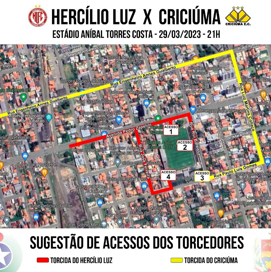 A Polícia Militar de Tubarão divulgou uma sugestão de acesso aos torcedores do Hercílio Luz e do Criciúma para a partida válida pelo segundo jogo da semifinal, que acontece nesta quinta-feira (29), às 21h, no Estádio Aníbal Torres Costa, em Tubarão.