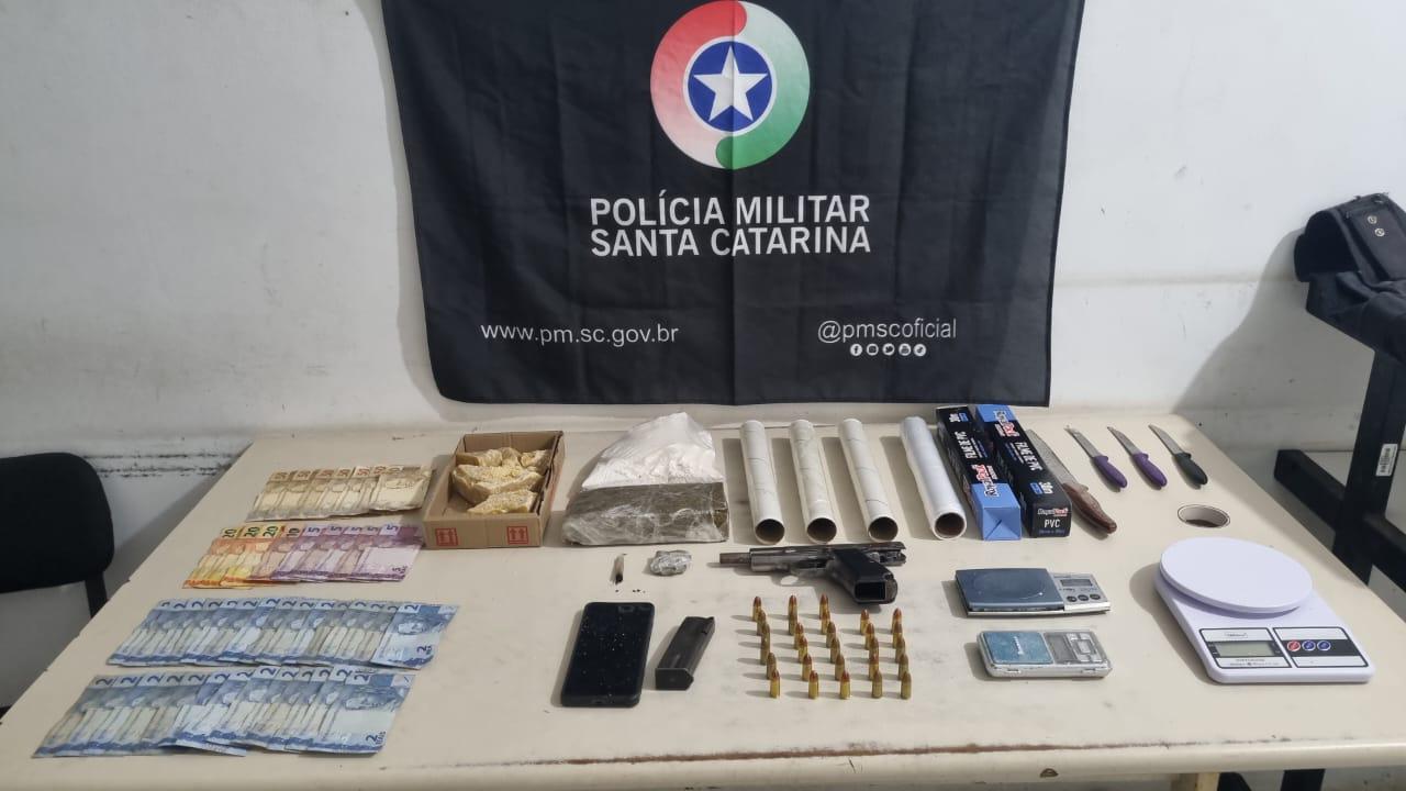Durante a tentativa de fuga, o suspeito invadiu outros imóveis, mas foi interceptado e preso dentro de um banheiro, onde estava portando uma pistola calibre 9 milímetros, 28 munições, além de uma sacola plástica com 540 gramas de crack e um tablete de 620 gramas de maconha.